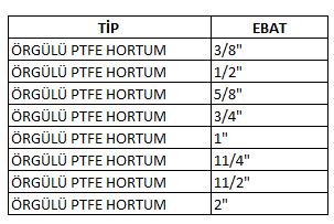 -PTFE hortumları çeşitli sınıflarda da içleri düz ve boğumlu olarak başlıklarının  uç kısımları havşalı şekilde montaj esnasında içinden geçen ham maddenin metale değmesini engellemekle kalmayıp %100 oranda hijyen sağlar.